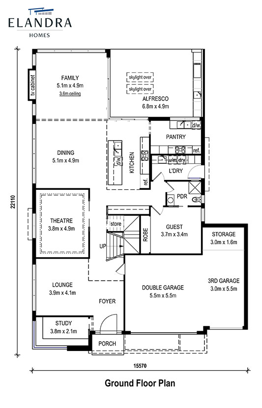 - Large open plan living with a popped-up roof to provide a 3.6m high ceiling over the family room.